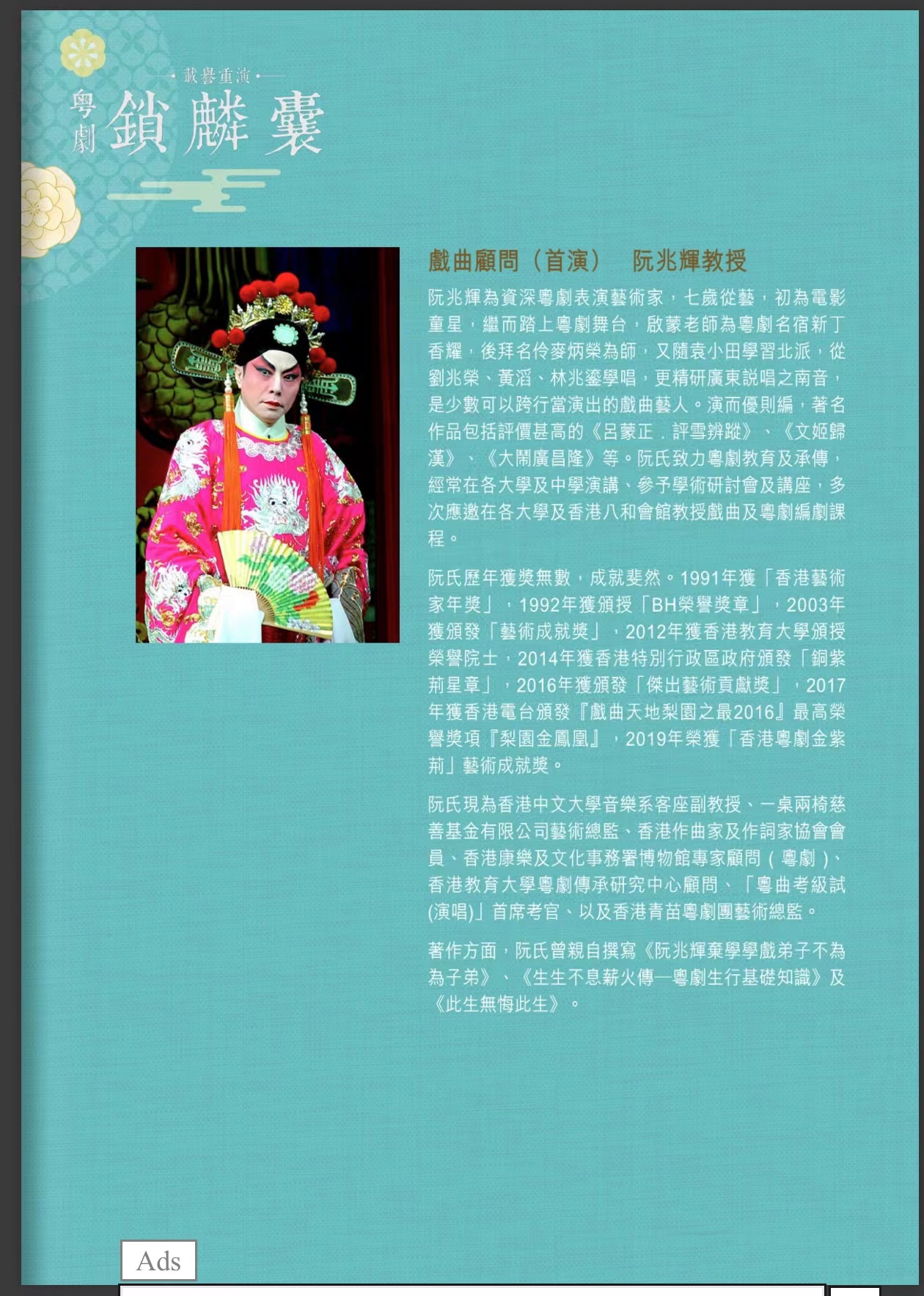 中華時報傳媒集團主席、香港美術學院院長曾曉輝教授表示,於(11月13日)晚上很有幸欣赏到粵劇《鎖麟囊》,该劇顯出清新,衝出了傳統的「六柱制」,以女性情義為主,在戲劇而言,既具「文學性」、「音樂性」,而且舞台設計非常唯美,此劇目開拓了粵劇另一個「新浪潮」。