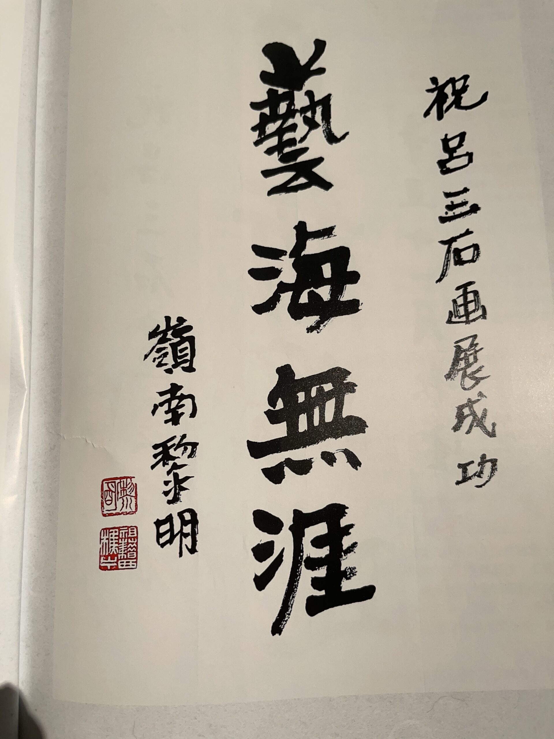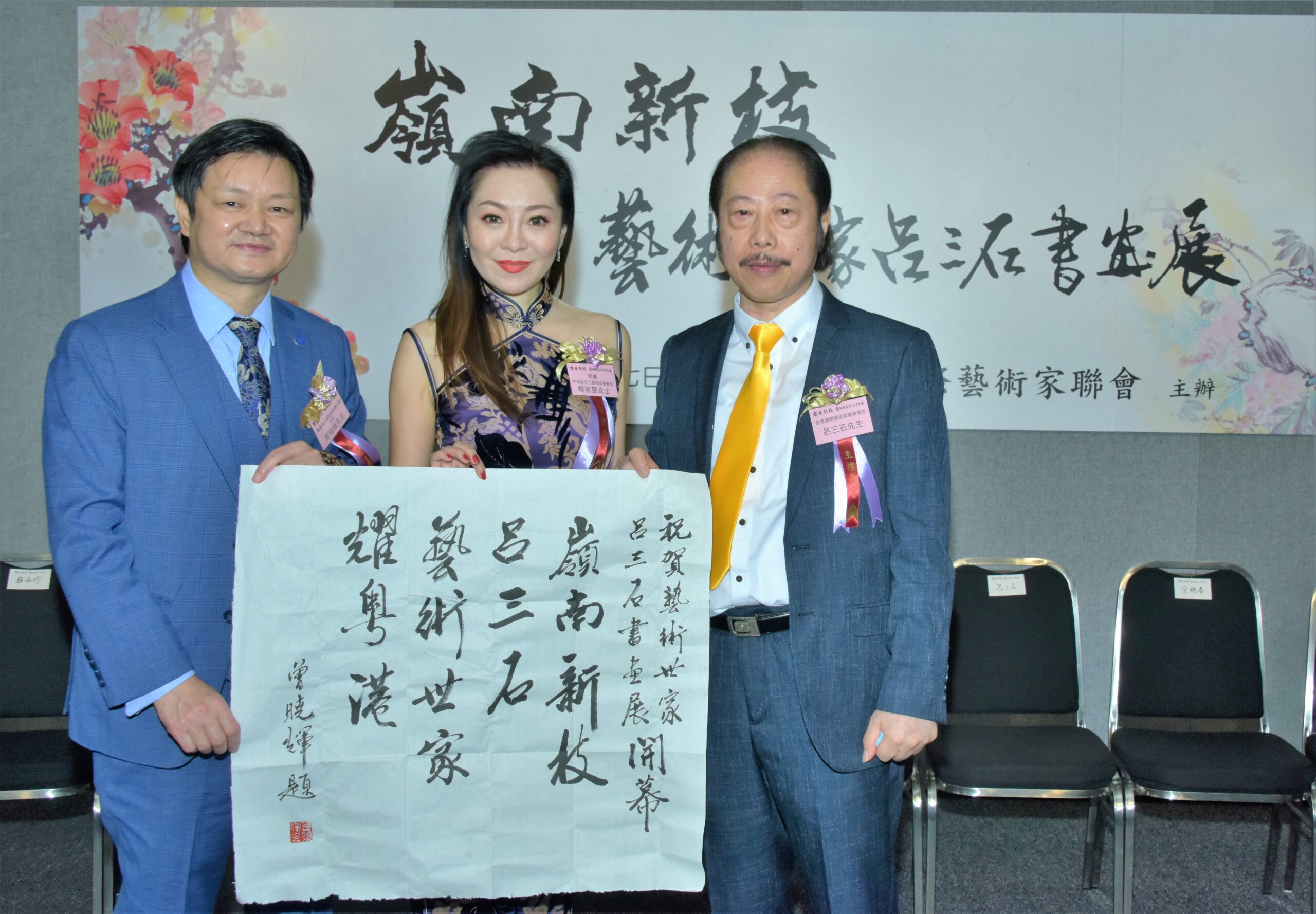 曾曉輝在開幕式上,贈送一張書法「嶺南新技呂三石 藝術世家耀粵港」給呂三石先生以祝賀書畫展成功。