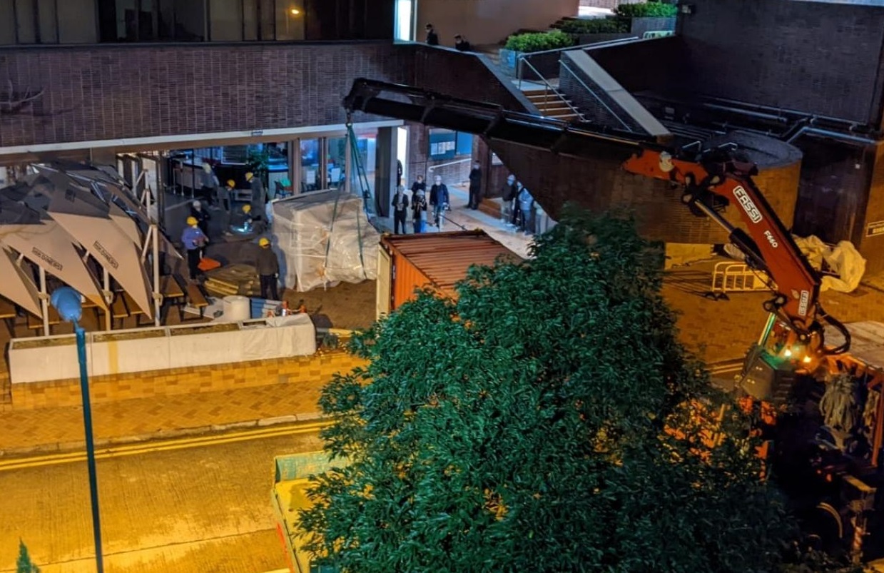 港大校園媒體學苑新聞昨晚在社交媒體上載相片,顯示有工人用圍板及布幕圍封雕塑。本台記者現場所見,大批工程人員深夜施工,不時傳出敲鑿聲,凌晨4時許見到有包好的部件運送出來,其後有另一件大型的部件運出,早上已運離校園。