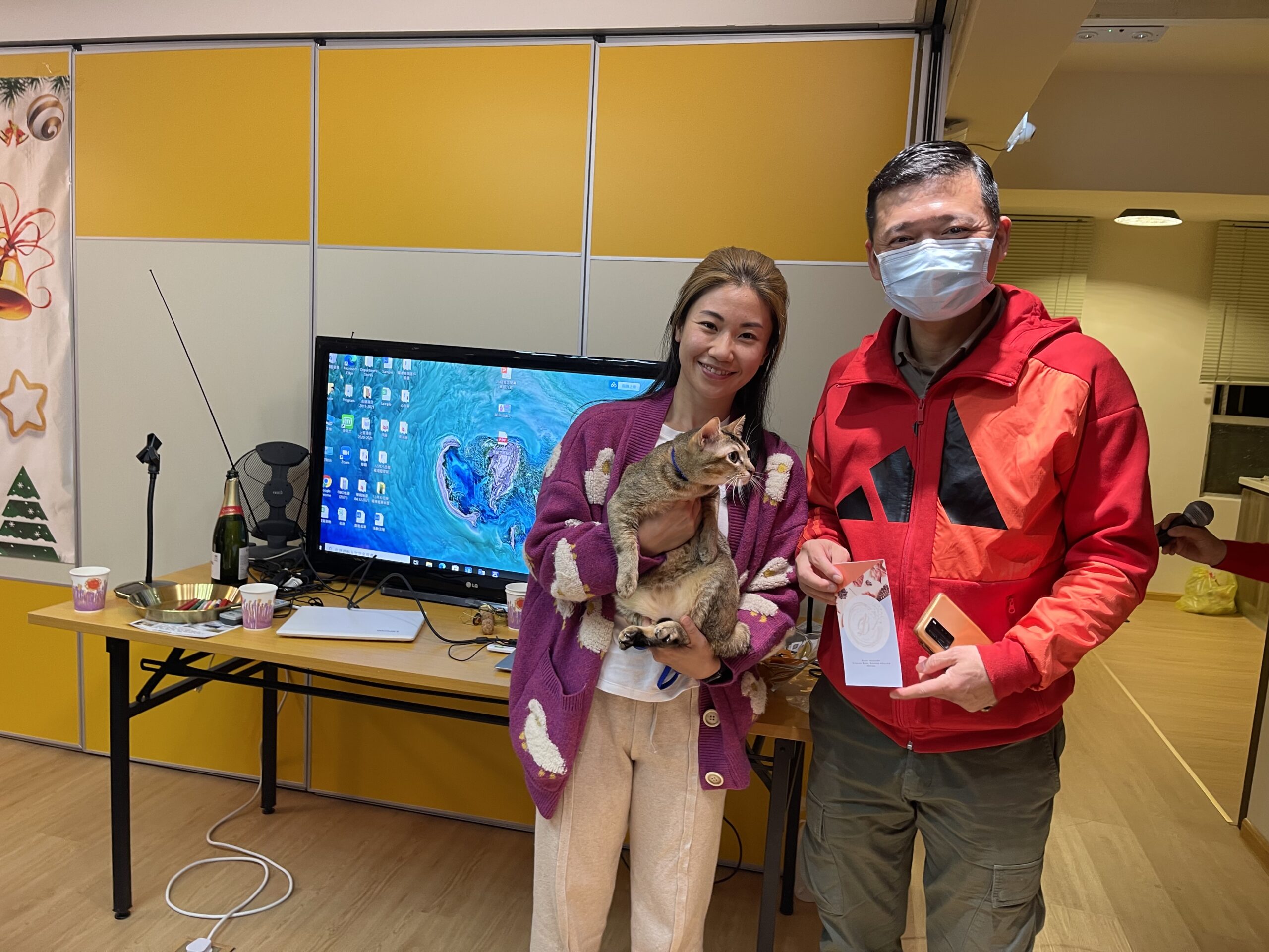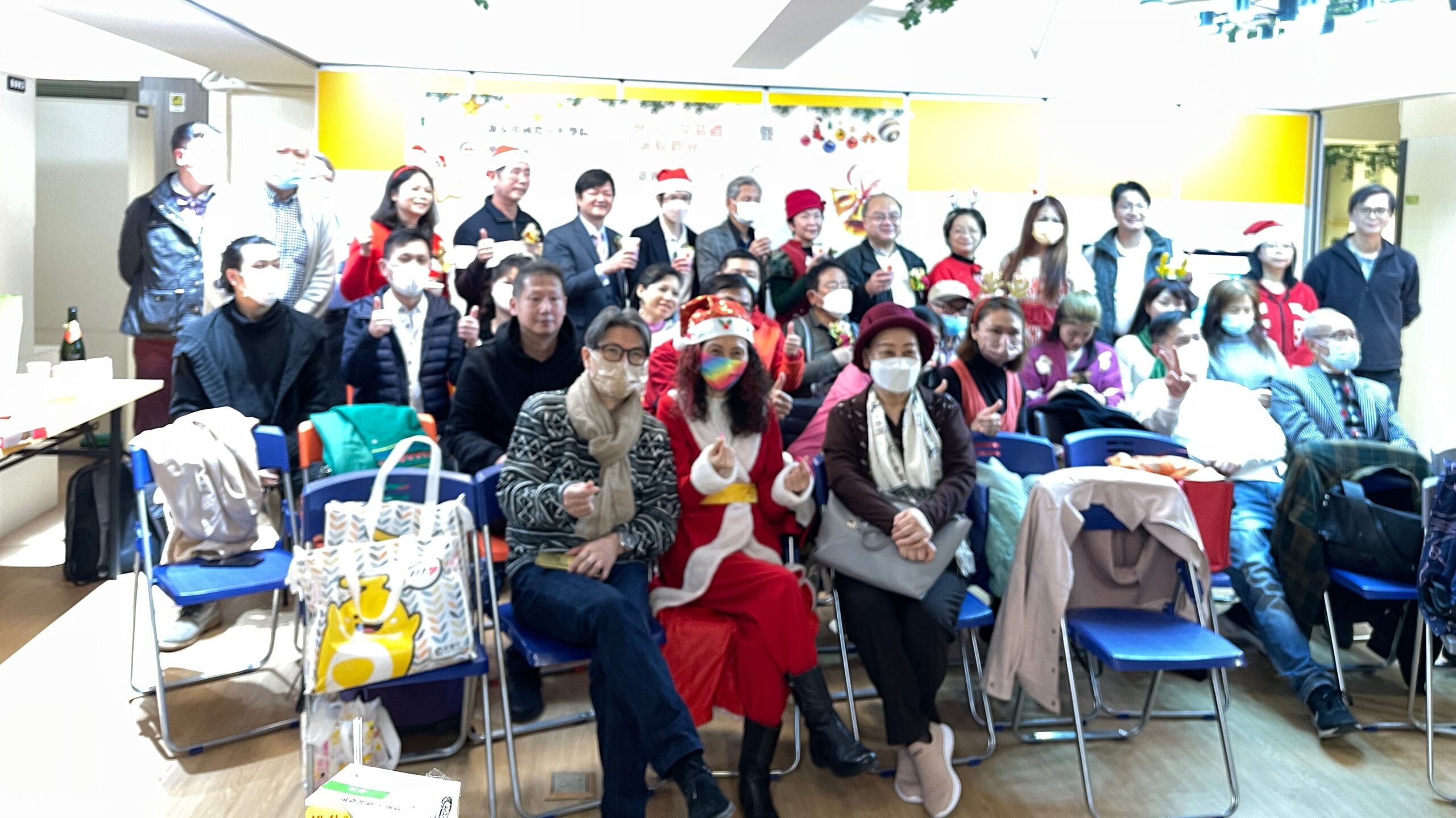 今天是圣诞节,参加者大多穿戴具有聖誕氣氛的衣飾 ,也按照传统习俗自備一份價值HK$50以內的小禮物作互相交換用及抽奖。