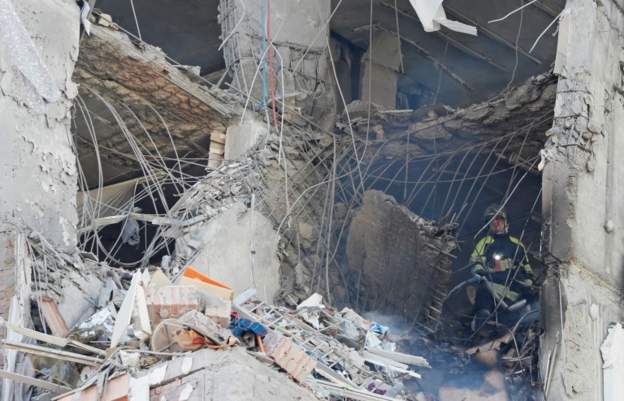 ·基輔市區一座居民大樓被導彈擊中並承受嚴重損害。