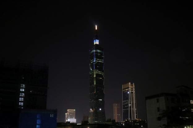台北101大樓亮起烏克蘭國旗顏色
