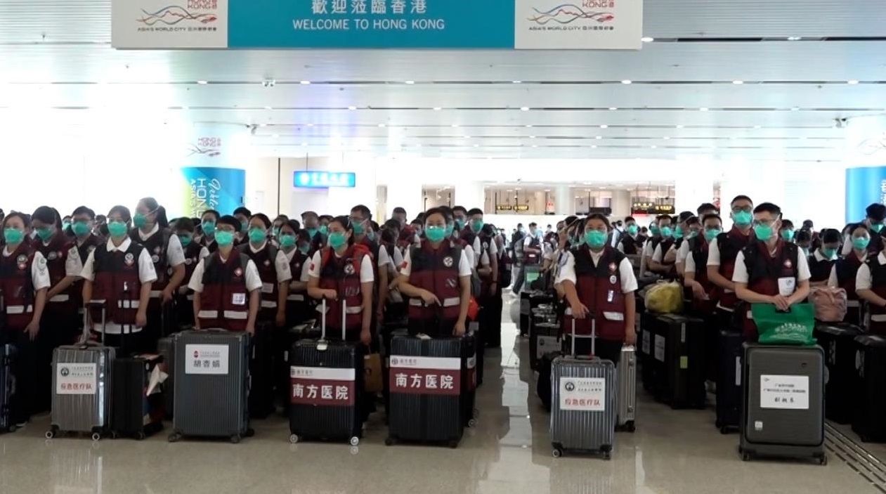 新一批約300名內地援港醫療隊,下午經蓮塘口岸到香港。行政長官林鄭月娥、醫管局主席范鴻齡及中聯辦代表等到場迎接。