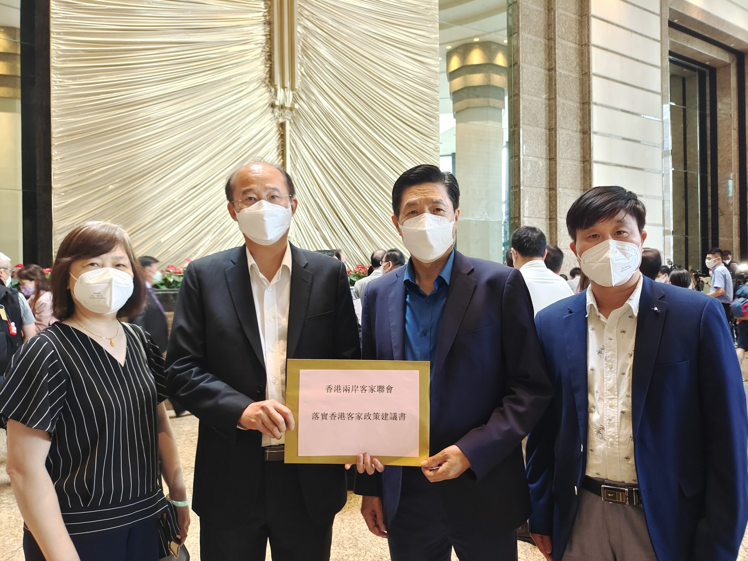 (中華新聞通訊社/中華時報香港4月26日訊)4月27日,香港兩岸客家聯會向第六屆行政長官候選人李家超辦公室遞交《落實香港客家政策建議書》,由香港兩岸客家聯會會長江全孚,兩岸客家研究院院長李劍諸,香港兩岸客家聯會常務理事兼副秘書長廖潤昌、蘇建輝、劉秀娟,副秘書長葉淑平提交,特首候選人李家超競選辦公室主任、全國人大常委譚耀宗代表接收。