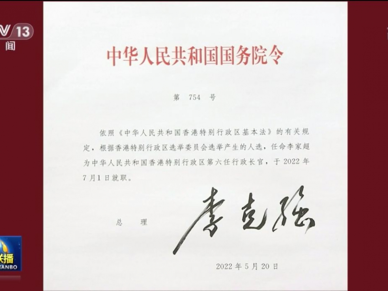 國務院總理李克強上周五簽署國務院令,正式任命李家超為香港特別行政區第六任行政長官,7月1日就職。李克強說,相信李家超就任後,一定能夠團結帶領香港特區新一屆政府和各界人士齊心協力,開創香港發展新局面。