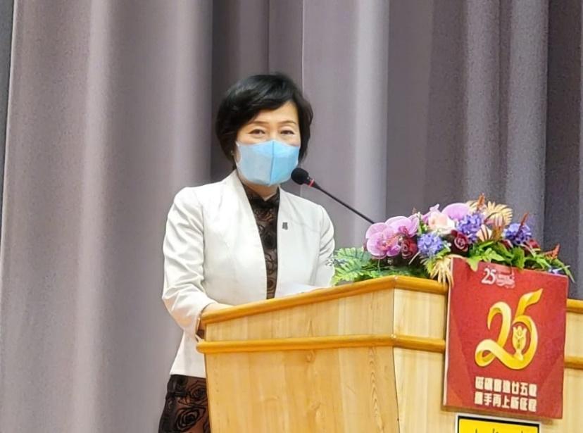 教育局局長蔡若蓮致辭時表示,很高興出席由覺行念慈基金會主辦的「慶祝香港回歸25 周年暨世界和平書法日」,有機會與大家一起見證師生齊心協力,用我國書法,創造世界紀錄的歷史時刻。這項活動可以讓同學感受書法藝術之美,陶冶性情,洗滌心靈,增強對中華文化的了解與欣賞,實在是不可多得的學習經驗。