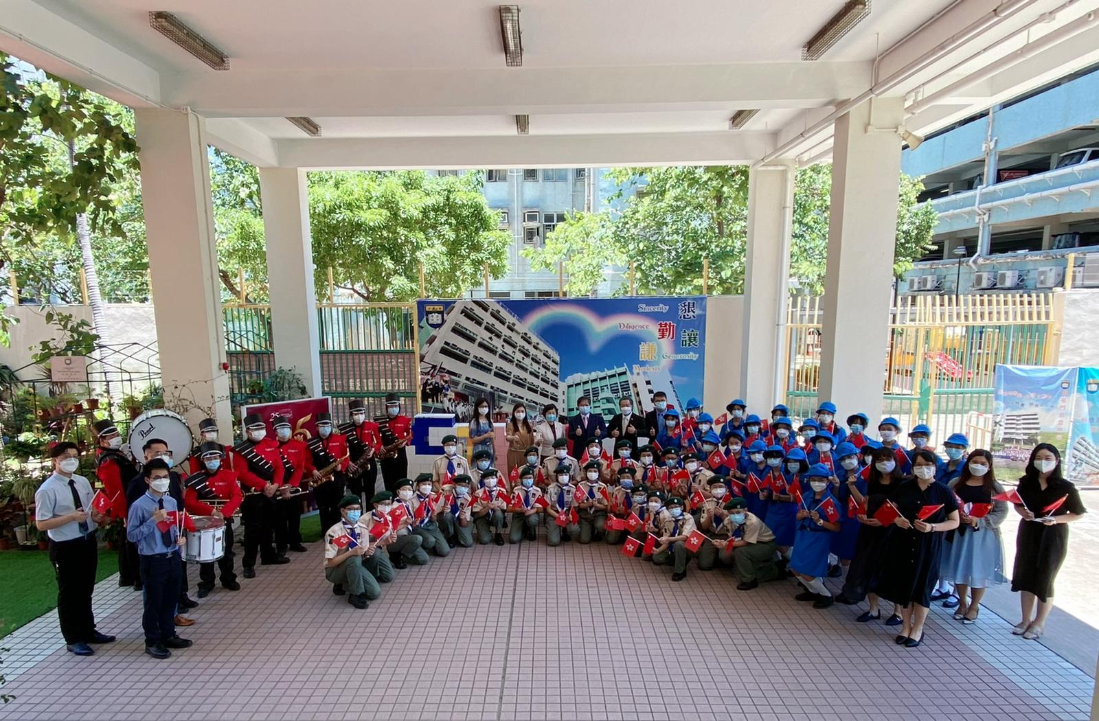 香港教育局局長蔡若蓮博士, JP (前排中)、教育局首席教育主任何慕琪女士(右三)、覺行念慈基金會聯合創辦人張德熙博士(左三)、南屯門官立中學陳耀明校長(右二)、教育局學校發展組總學校發展主任 (屯門)韓憲茵女士(右一) 、SDG WR 官方認證人員 鍾善恆(左一)合照。