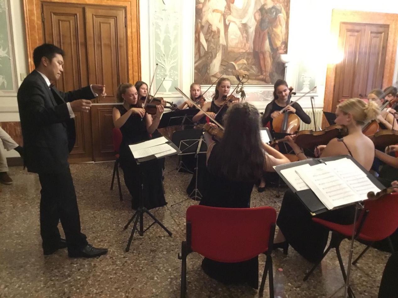 中華新聞通訊社/中華時報訊)威尼斯台灣31藝術家雙年展開幕儀式十分隆重,威尼斯市政府社會安全局長愛麗絲貝達·貝雪(Elisabetta Pesce)代表威尼斯市長路易斯·布魯那羅(Dott. Luigi Brugnaro)參加,文化界多人到場,蕾蒂琪婭·米開羅(Prof. Letizia Michielon)義大利音樂學院教授、著名鋼琴家、作曲家、哲學家、演藝協會會長,其他有德國知名雕塑家Antije Tesch,及其夫婿德國前部長先前參加了義北帕爾瑪義大利今年定為歐洲文化城的盛會,剛剛把大型雕塑作品「希望」(Hope)佈展在市中心,便趕來參加台灣藝術家聯展開幕式。館方今天還特別安排德國斯圖卡市靑年交響樂團助陣,演出一場盛大開幕音樂會,為畫展展開序幕,演出精彩,掌聲不斷,也為台灣藝術家的聯展增色不少,現場氣氛溫馨!