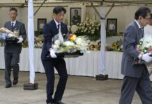 (中華新聞通訊社/中華時報9月27日訊)日本已故前首相安倍晉三「國葬」今天下午舉行,約4300人出席的會場內播放回顧安倍從政以來關鍵談話與重大政績,場外設置的獻花台也有超過萬人到場獻花惜別,場面哀戚。