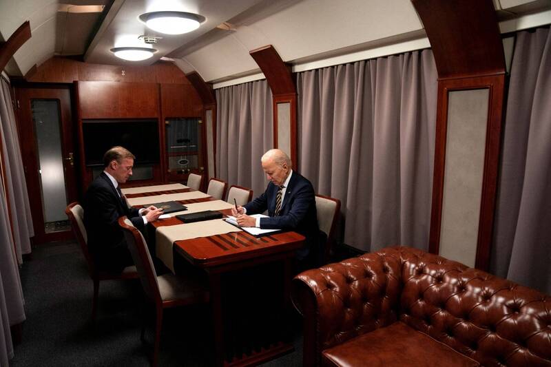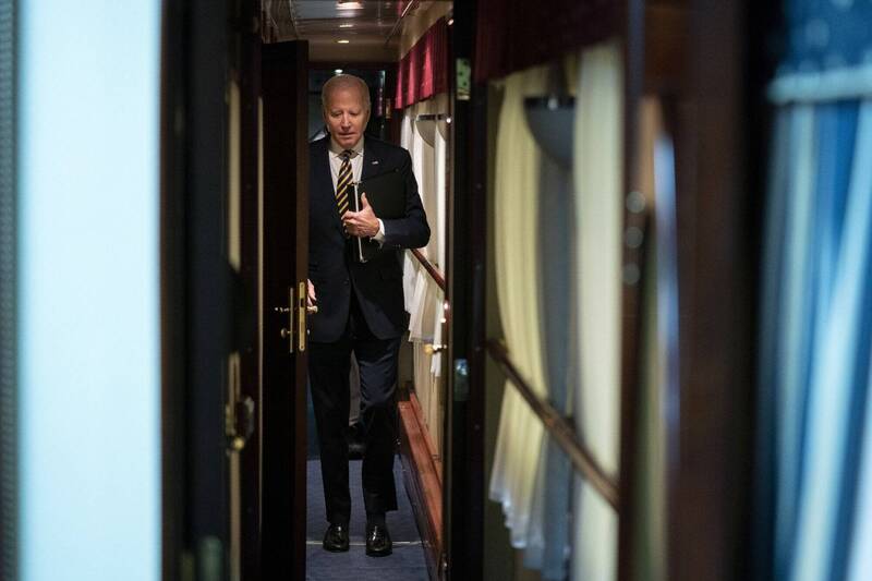 拜登抵達熱舒夫後,經過1小時車程後抵達普瑟米斯(Przemysl),隨後拜登搭上火車,火車在黑夜中行駛,車上也部署大量特勤局人員,火車行駛約10小時才抵達基輔。