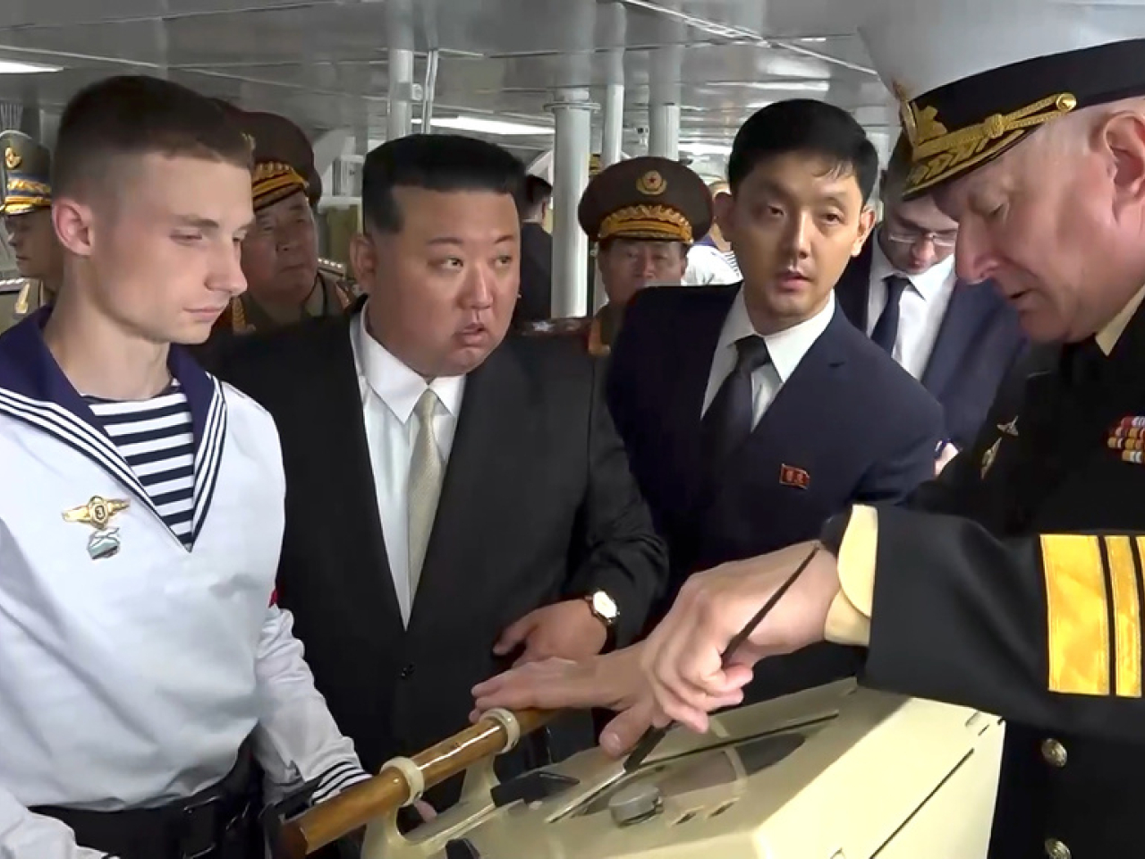 隨後金正恩周六登上俄羅斯沙波奇尼科夫元帥號軍艦,受到護艦長迎接,並在俄羅斯艦隊總司令葉夫梅諾夫的陪同下參觀這艘軍艦反魚雷的火箭發射系統。