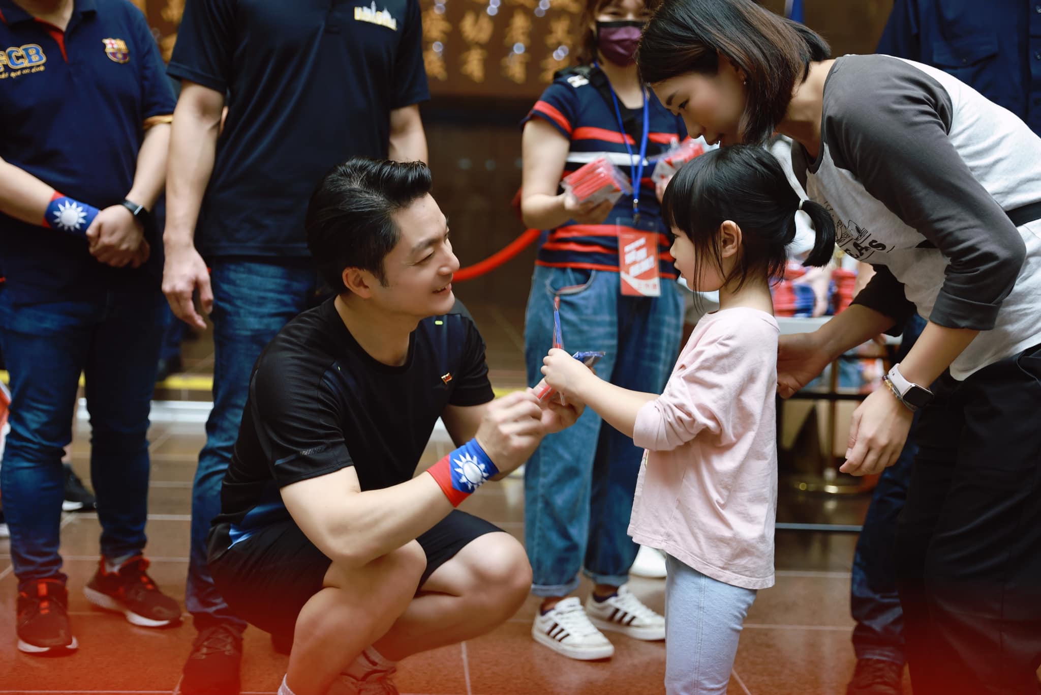 蔣萬安穿著一身運動服,手腕上戴著國旗圖案的腕帶,左胸上也別著國旗徽章,不但帶頭跳操,還帶著三個孩子一起路跑。蔣萬安說,昨天告訴三寶要陪爸爸國慶慢跑,三寶都很興奮,尤其二寶還練習跑步,今早5點就換好衣服、吃完早餐,準備出發。