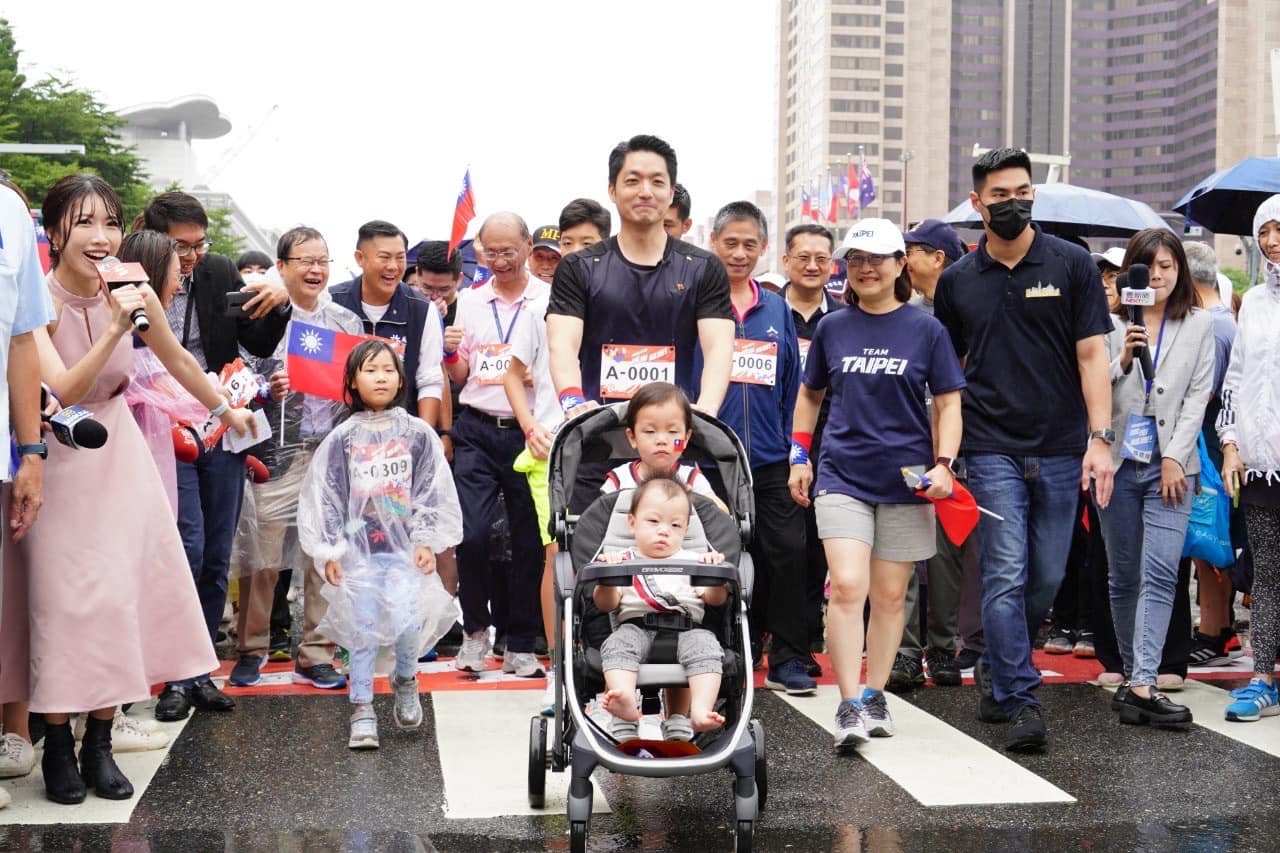 蔣萬安用推車推二寶、三寶小跑一段路,因雨勢變大,就先讓他們回去休息,後續的路程由大兒子陪同一起跑完。