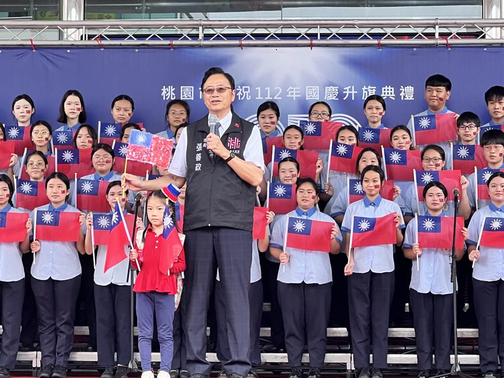 (中華新聞通訊社/中華時報10月10日台北訊)桃園市政府10日擴大規模舉辦升旗典禮,湧入逾3000人擠滿府前廣場,市長張善政特別邀請以青天白日滿地紅裝扮出席的小女孩一起上台致詞,他說國旗見證中華民國蓽路藍縷開國,到如今站穩腳步、受到國際尊重的辛苦過程,雖然不同立場對國家發展有不同意見,但國旗應是所有人核心價值,國家有難就該所有人團結在國旗底下為中華民國打拚,國家絕對會繼續進步、希望無窮,過程也發生7旬婦因太興奮昏倒送醫,所幸並無大礙。