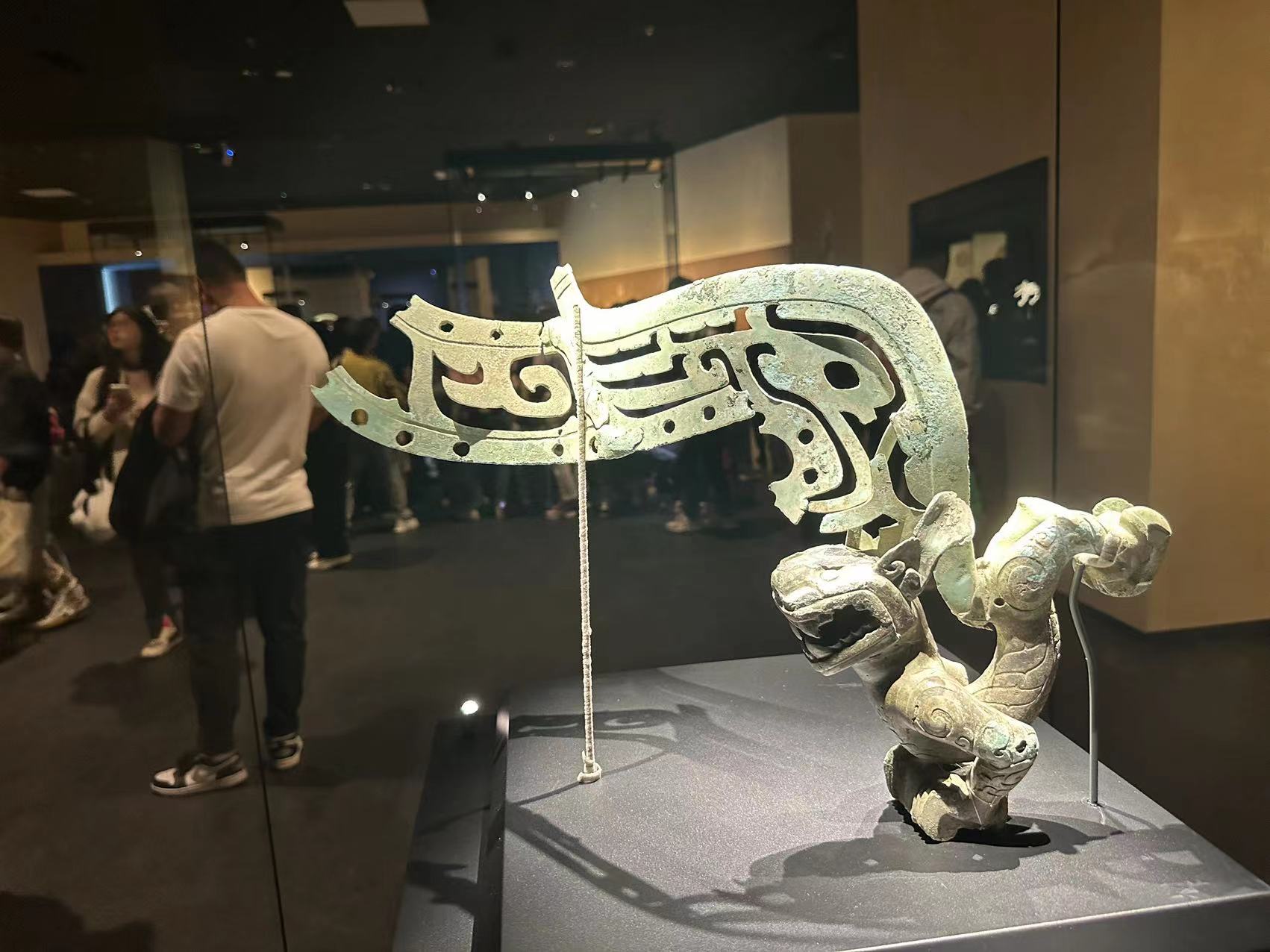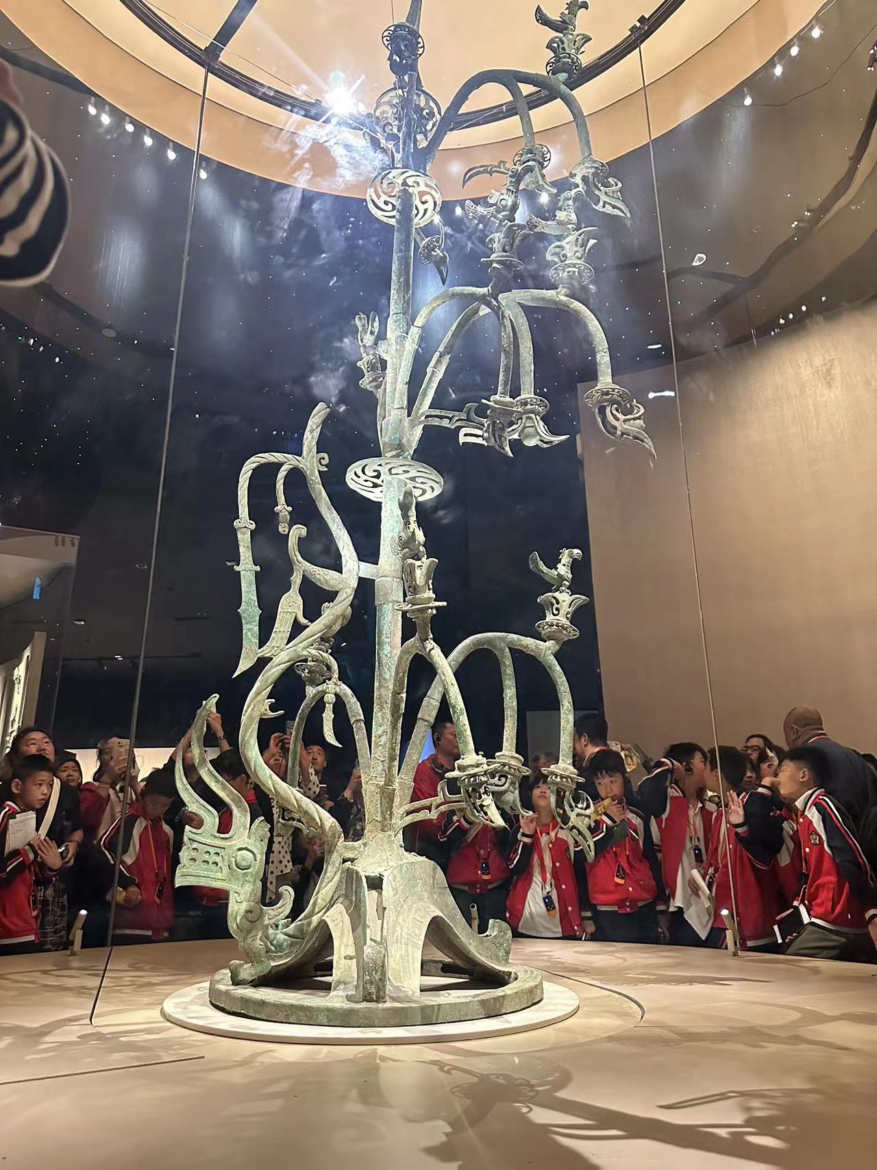 另一個令人嘆為觀止的展品是一號青銅神樹。這座青銅神樹高達3.96米,樹幹殘高3.84米,是全世界體量最大的商周青銅器。它有三層樹枝,樹枝上的花果或上翹,或下垂。九隻太陽神鳥棲息在樹上,栩栩如生。而在神樹的下部懸掛著一條龍,龍的頭朝下,尾在上,姿態婀娜多姿,賦予了神樹非凡的魅力和深厚的象徵意義。