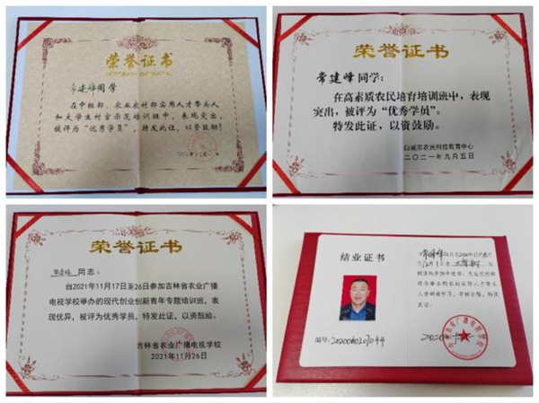 他是一个勤奋好学,学以致用的人。自己不仅通过参加白城市农广校、组织的省内外培训学习,他成为名副其实的新型职业农民,陆续获得了中组部、农业农村部农村实用人才带头人培训班、吉林省和白城市高素质农民培训班优秀学员荣誉。2023年11月,白城市农广校推荐他参加吉林省乡村产业振兴带头人培育“头雁”项目培训学习,被推荐任命为“头雁”培训班学生会主席。