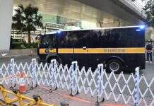 法院外加強保安,反恐特勤隊、裝甲車在以及警車在法院外戒備。