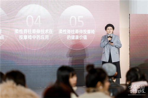 她表示,脊柱健康是世卫组织认为易被忽略的十项健康问题之一,将柔性脊柱牵伸技术应用于按摩椅,对通督强脊,升提阳气;松筋散结,舒筋活络;行气活血,温经散寒;缓解疲劳,促进睡眠都有着积极作用,顾家家居将该技术应用于欧米伽按摩椅,让按摩椅做到“懂你身型不盲按”,是真正关心女性的科技突破和产品创新。
