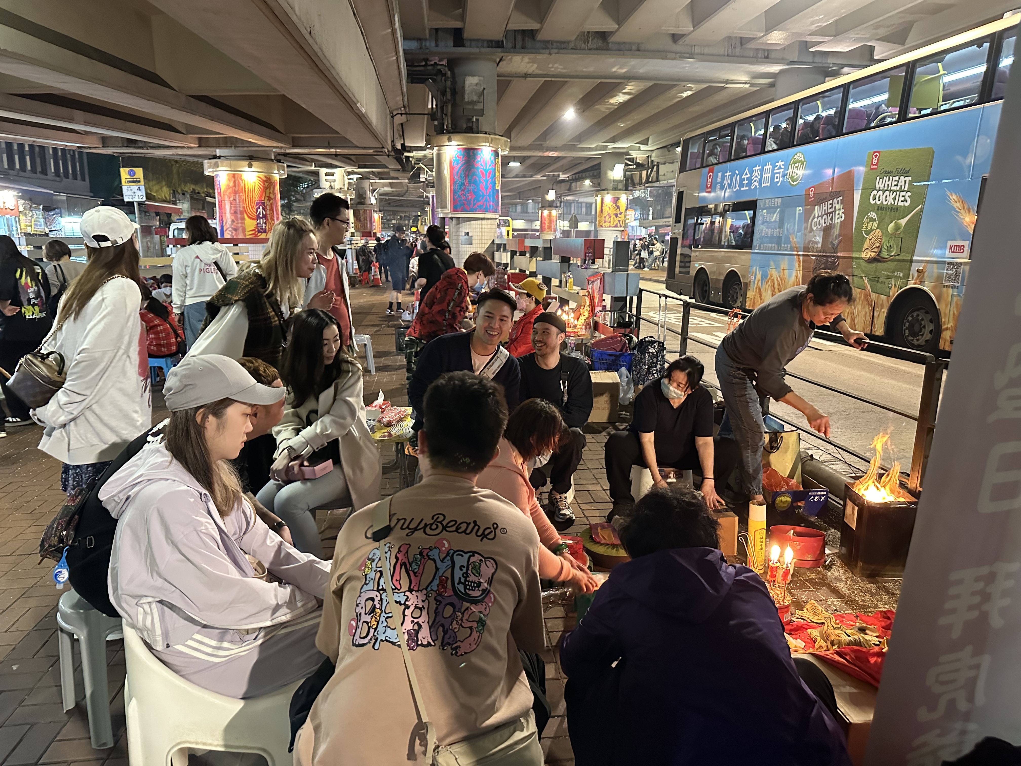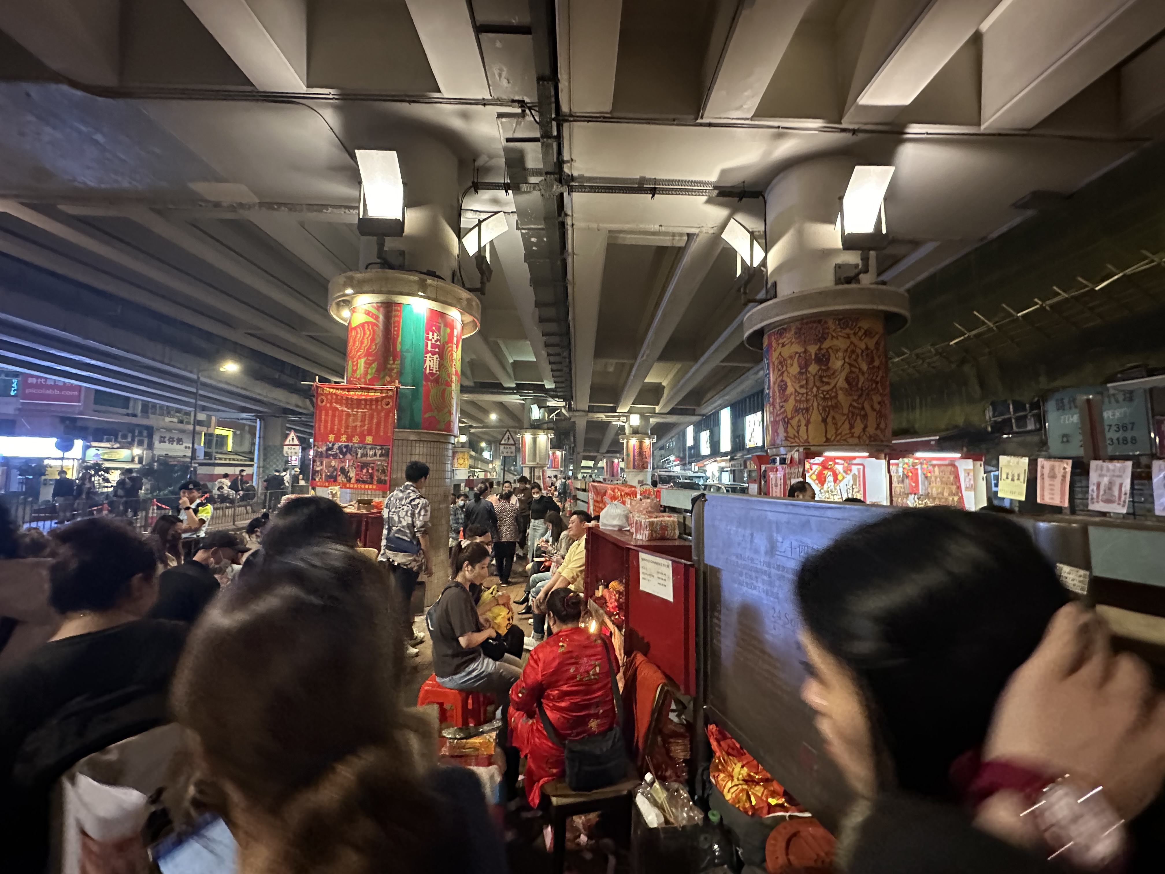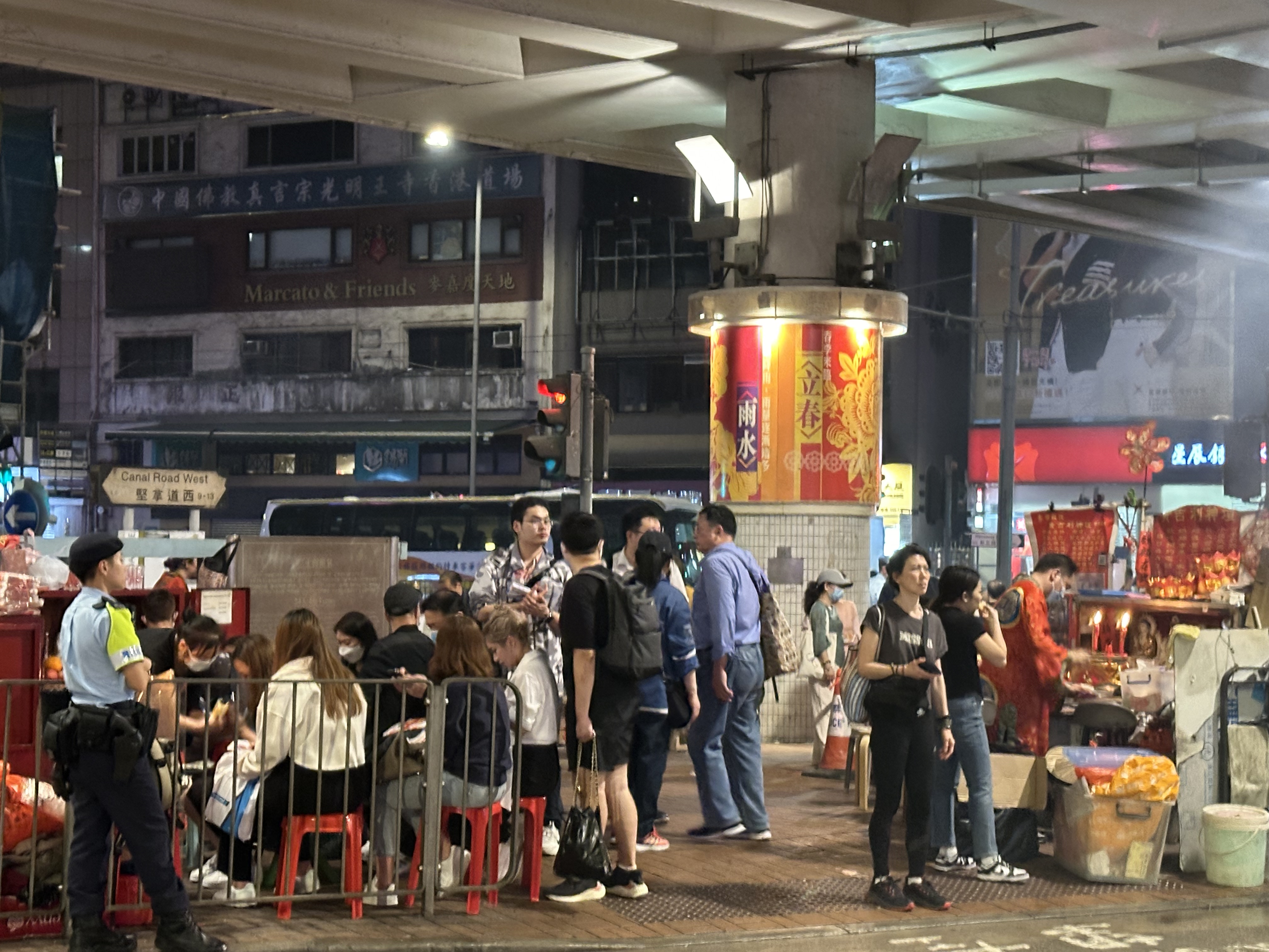 在香港銅鑼灣鵝頸橋下,有一個神秘的「打小人」據點吸引著許多路人和信徒的注意。這個據點位於繁華的鬧區,設有多個攤位,中央擺放著燭火祭品和神像,一旁還有幾個小凳子的攤子,給人一種神秘的氛圍。