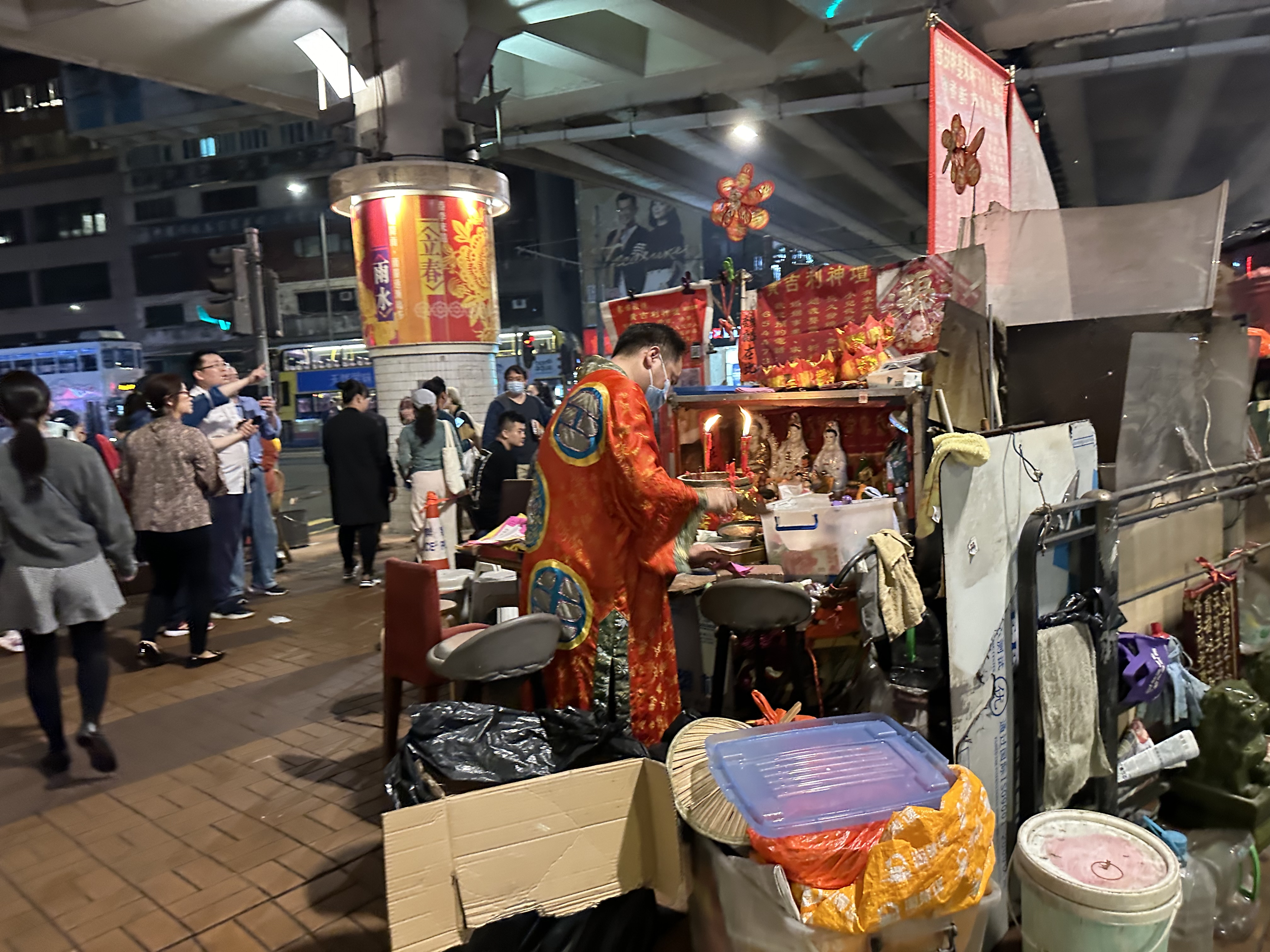 每個攤位都掛著自己曾上過媒體報道或接受採訪的牌子,顯示他們的專業性和知名度。這些攤位提供「打小人」服務,每次收費為50港幣。這種服務吸引了許多路人駐足觀望,也有排隊請客的信徒虔誠地前來尋求幫助。