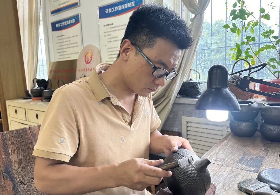 一個年輕小夥子介紹到,作為一家傳承了150多年鐵器工藝的企業,晉韻堂堅持”創意優先、精益求精、以質取勝”的宗旨,將傳統手工技藝注入全新的生命力。他說,從生肖牛壺、瓶壺等經典產品,到融合紅色文化、校園文化等的創新設計。