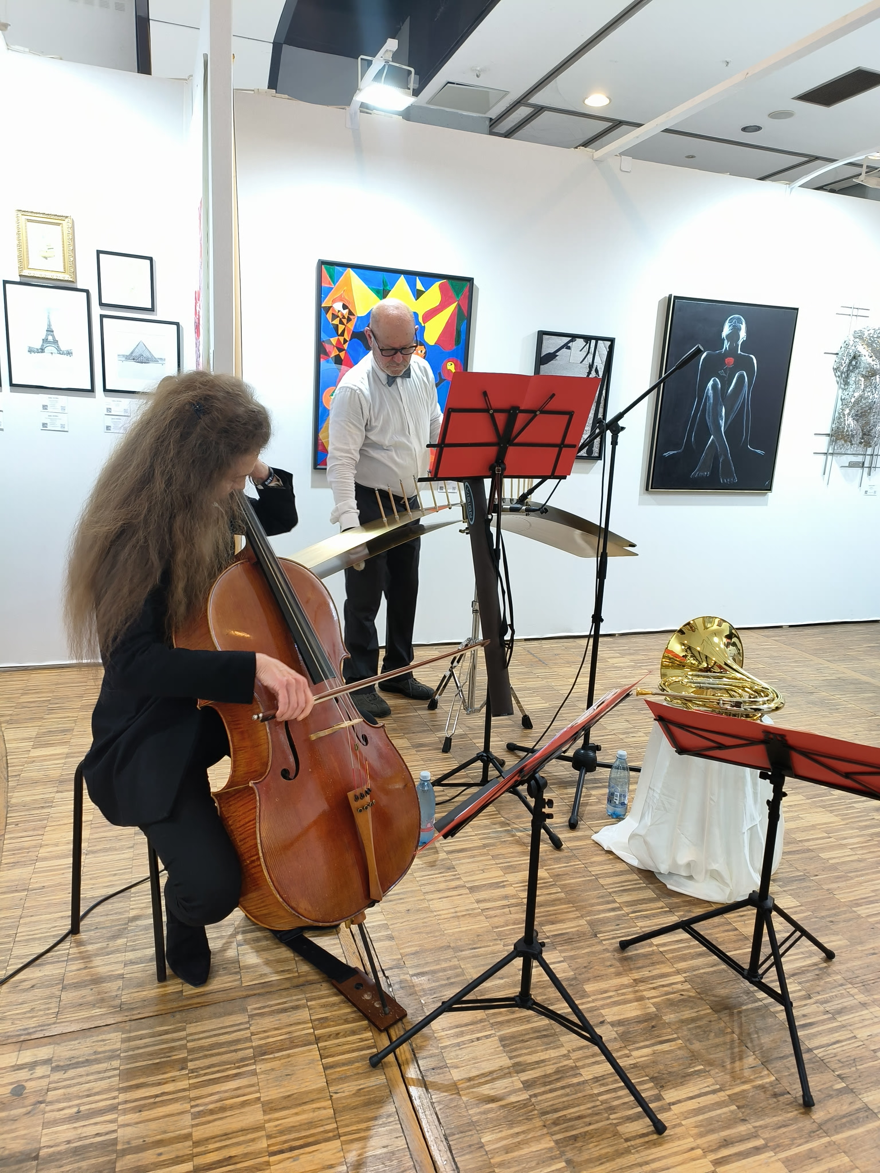 展會的開幕晚會更是令人印象深刻。晚會以著名導演陳紅霞與A-play藝術團帶來的震撼行為藝術表演《Peur primitive》拉開帷幕。這場表演如同一場充滿原始力量的視覺與情感碰撞,瞬間將觀眾帶入了深邃的藝術世界。表演結束後,音樂家Laure和她的團隊為大家呈現了一場悠揚的古典音樂演奏,優美的大提琴聲與圓號的雄渾交織在一起,仿佛秋日的微風輕輕拂過心靈,帶來了寧靜與激昂相融的音樂時光。