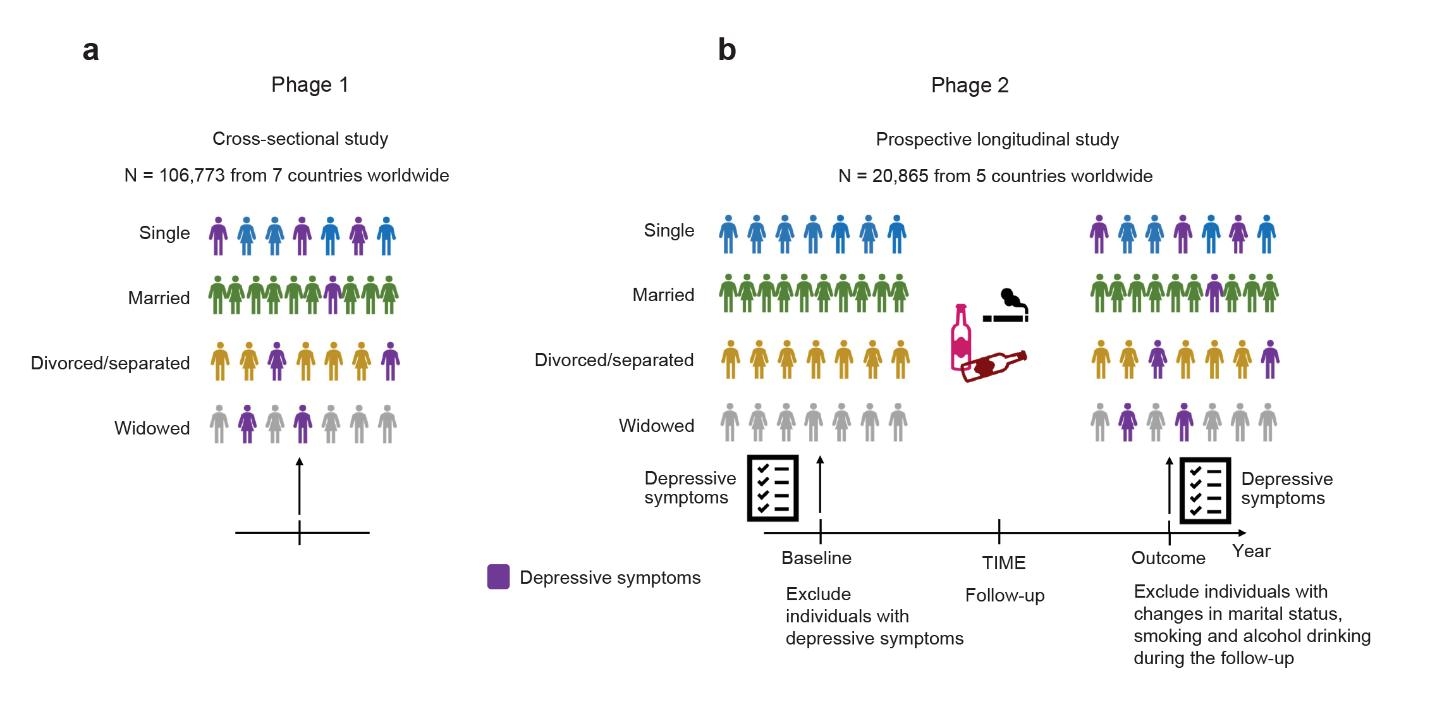 基於此,在本項研究中,論文共同通訊作者、澳門理工大學應用科學學院李克峰副教授及同事和美國哈佛大學公共衛生學院合作夥伴等一起,分析了來自美國、英國、墨西哥、愛爾蘭、韓國、中國和印度尼西亞7個國家的106556名受試者的個體層面數據,並對其中20865人隨訪了4年至18年,以研究已婚個人和未婚個人的抑鬱症狀風險。