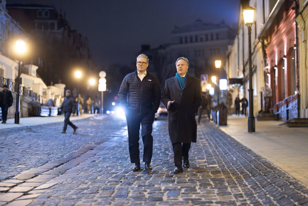 16日一早抵達基輔訪問,訪問期間與2023年秋抵任的英國駐烏克蘭大使哈里斯(Martin-Harris,右)在基輔街頭漫步。(英國首相府提供).jpg)