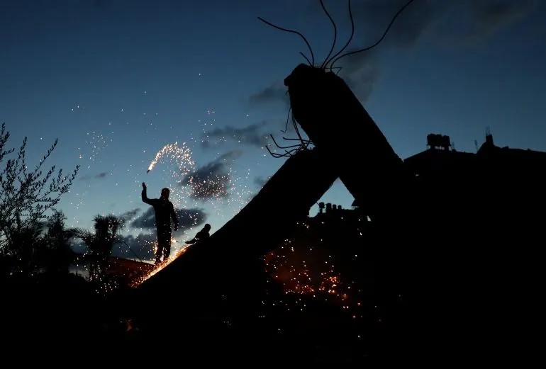 照片:隨著停火的臨近,加沙的巴勒斯坦人點燃煙花棒