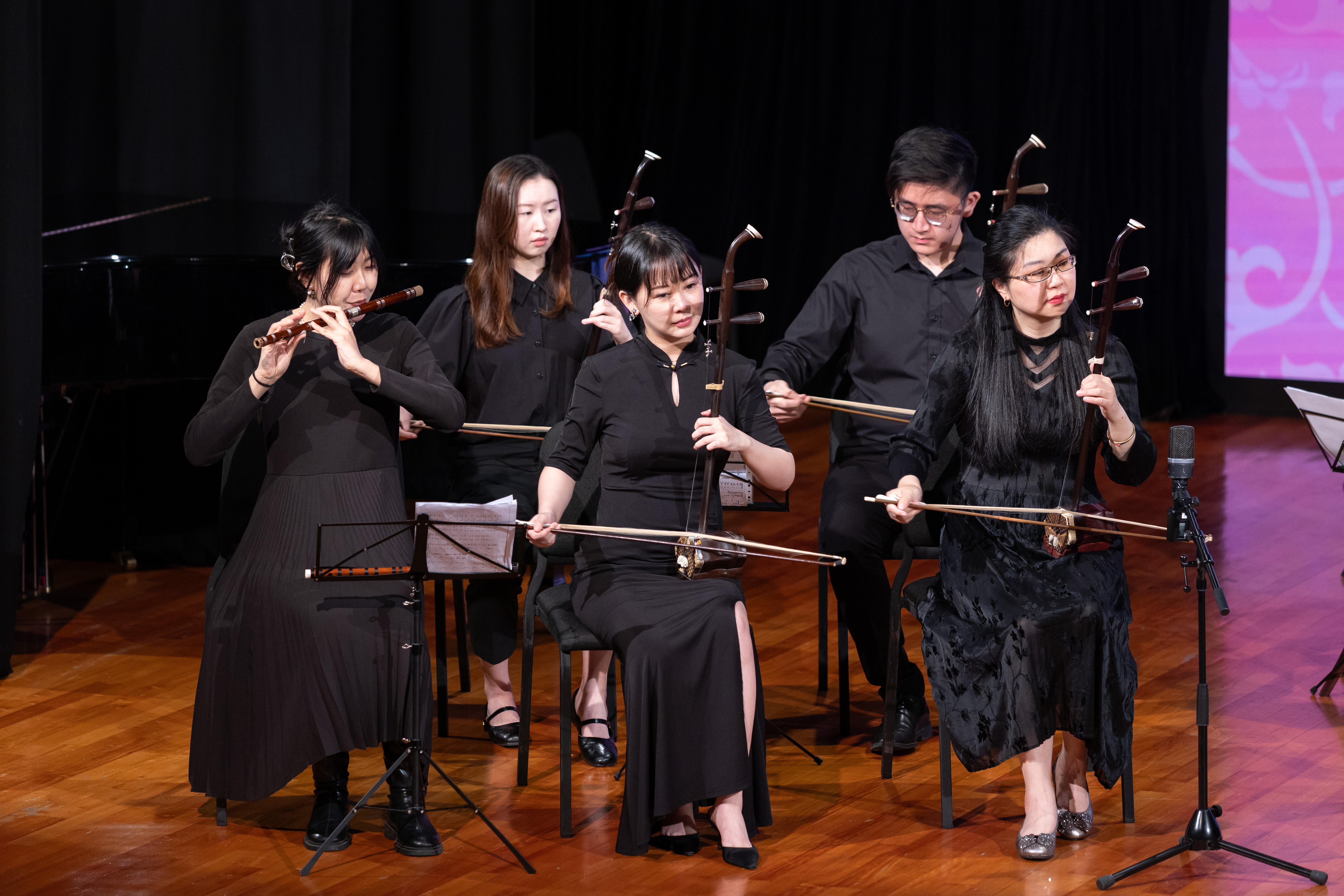 講座中,鄒博士演奏了多首曲目,包括與學生們共同演奏的《滄海一聲笑》和《鳳陽花鼓》,氣氛熱烈而融洽。特邀嘉賓們也展示了豐富多樣的演奏風格,從古箏到琵琶,無不展現出中國傳統音樂的獨特魅力。