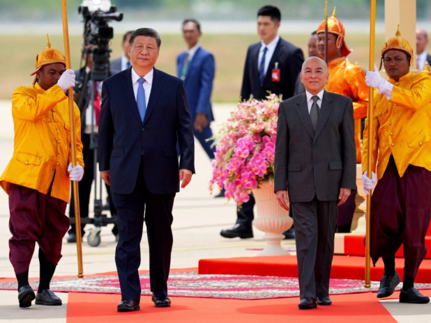 國家主席習近平乘坐的專機當地上午11時許降落金邊國際機場,應柬埔寨國王西哈莫尼邀請,國事訪問當地。專機抵達金邊國際機場時,西哈莫尼及人民黨主席、參議院主席洪森熱情迎接,習近平出席西哈莫尼舉行的歡迎儀式。