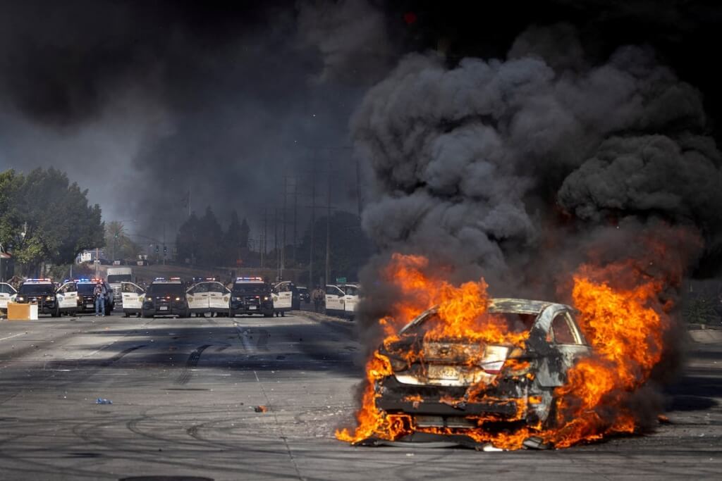 川普在他的「真實社群」(Truth Social)平台以貶抑詞提及加州州長紐松(Gavin Newsom)說:「如果加州州長『紐渣』(Gavin Newscum)和洛杉磯市長巴斯(Karen Bass)不能履行職責,眾所皆知他們做不到,那麼聯邦政府將會介入,用該用的方式解決暴動與搶劫問題!!!