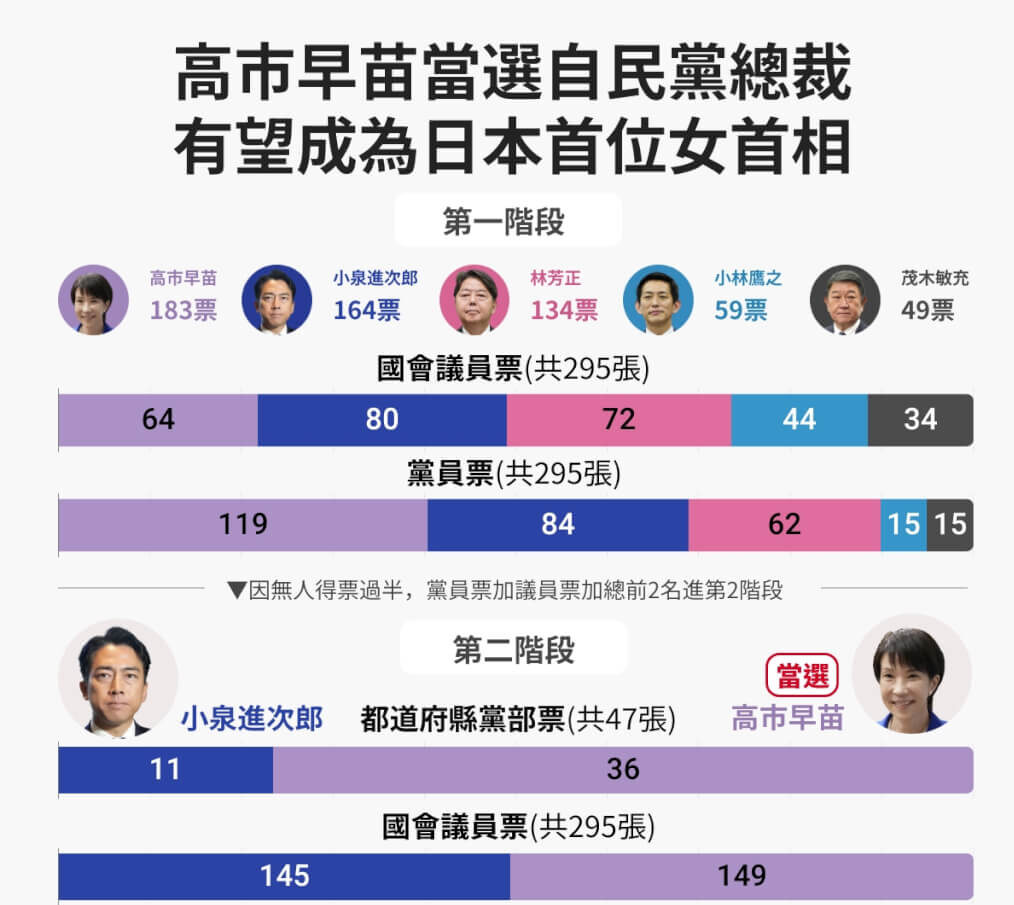 第2次參選的小泉進次郎這次成功進入決選,免於去年「一輪遊」噩夢重演,但最終獲得156票,不敵高市早苗的185票。兩人的「黨員票」差距頗大,高市第一輪黨員票多達119票,小泉雖排第2,但僅有84票。