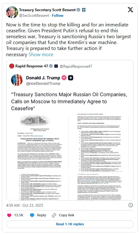 美國財政部長貝森特(Scott Bessent)在聲明中說:「鑑於普丁總統拒絕結束這場毫無意義的戰爭,財政部對資助克里姆林宮戰爭機器的俄羅斯兩大石油公司實施制裁。」