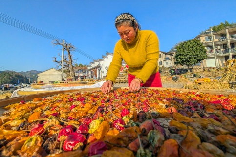 作品說明:此片于2025年12月7日攝于浙江富陽萬市鎮楊家村,金秋時節,家家戶戶房前屋後,滿鋪著辣椒、玉米、柿子、南瓜和稻谷,延續著山村傳統的“曬秋”習俗。這五谷豐登、色彩濃烈的景象,是浙西山鄉在豐收季節裏獨有的生活美學。