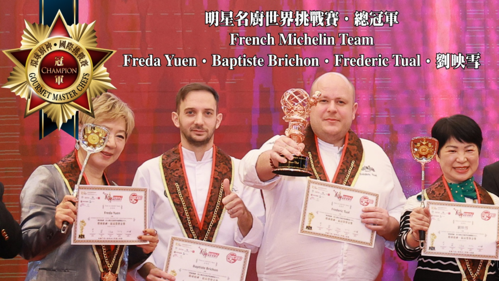 從個人極限到團隊榮耀,他們證明:偉大的廚藝,是點石成金的魔法。在「名人明星名廚世界挑戰賽」的巔峰舞臺上,當法國、泰國、新加坡三位駐華外交官將象徵全球餐飲界至高榮譽的「龍騰金杯」遞出,由兩位隊長 Frédéric  Baptiste 高高舉起時,全場掌聲雷動。而當劉映雪與袁月蕙一同獲頒世上無雙的「環球廚神.水晶鑊鏟」時,那份純粹的喜悅與榮耀,點亮了整個舞臺。French Michelin Team 已寫下全新篇章——真正的卓越,始於對每一瞬間的極致追求,終於對平凡食材的不凡詮釋。