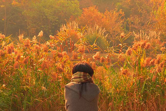 作品說明:這張照片拍攝於中國美術學院象山校區,上午9點左右的晨光裏。秋日暖陽給蘆葦與林木暈染出暖橙色調,裹著圍巾的身影隱在繁茂草木間。