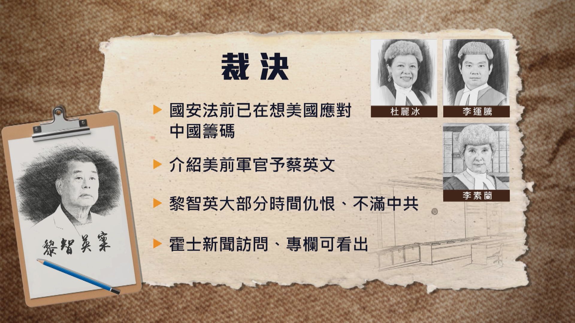 指定法官杜麗冰裁決時指,控方證人證供獲WhatsApp對話紀錄支持,黎智英在國安法實施前,已在思考美國有何籌碼應對中國,所以介紹兩名美國前軍官給台灣的蔡英文。亳無疑問黎智英大部分時間對中共懷有仇恨、不滿,在他接受美國霍士新聞的訪問及所寫的專欄可以看出。