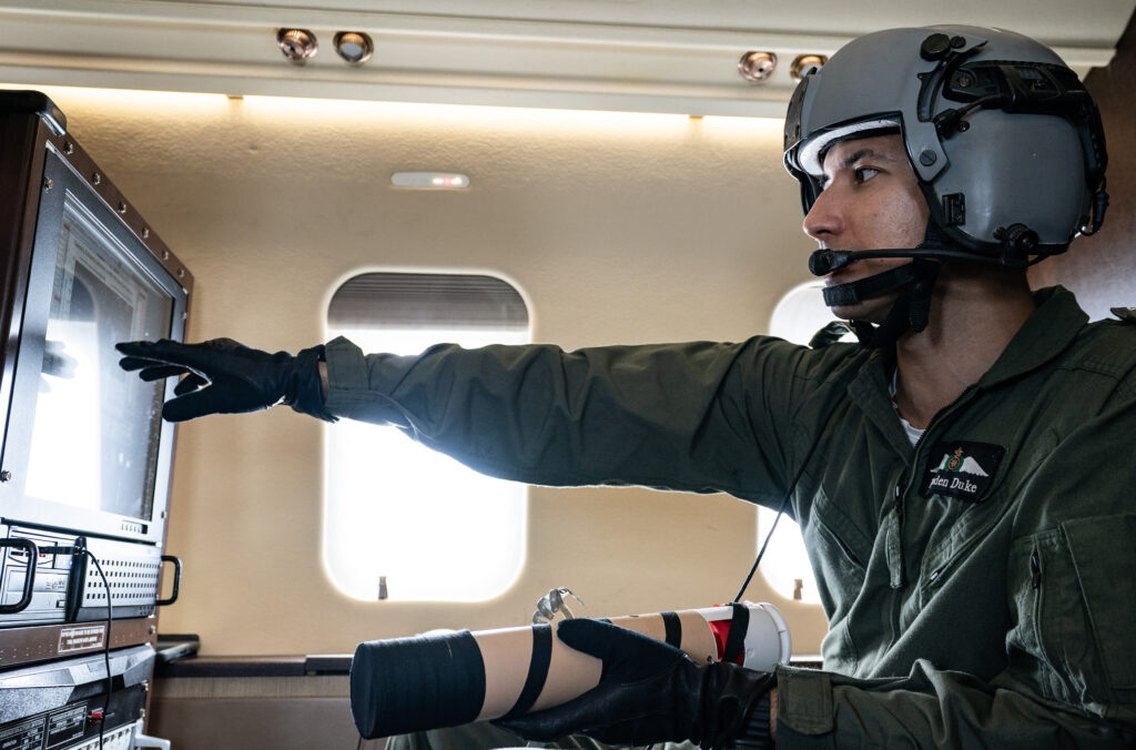 圖為在陳永熾執飛的定翼機上,機組成員杜克準備投放探測儀器。 中新社記者 侯宇 攝
