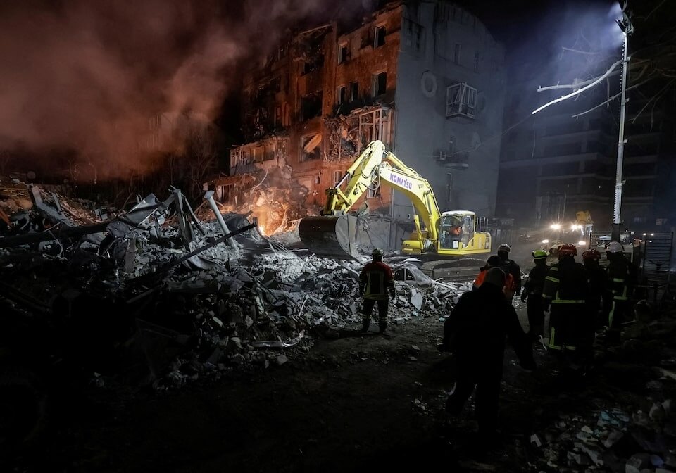 烏克蘭哈爾科夫2日一棟建築被俄羅斯空襲損毀,救援人員在現場搜救。(路透社)