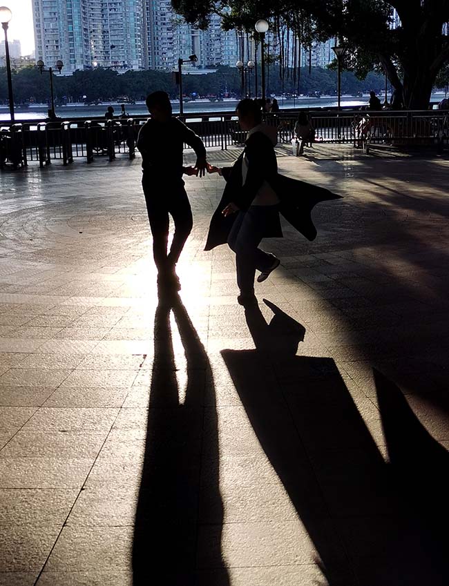 作品說明:2026年元月2日,去公園遊玩出來,路過某公眾舞池,其時夕陽西斜,喧囂的人群已然散去,一對舞伴仍在舞池留連,長長的影子拖在地上,隨舞步而變動,即就逆光位,用華為手機攝下此景。