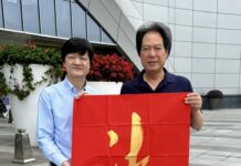 圖為本文作者曾曉輝(中)贈送掛歷給友人並合影