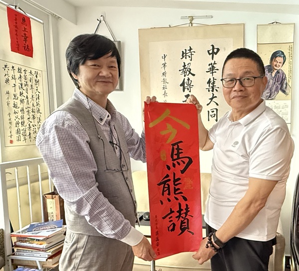 據悉,年近七旬的劉冠逸記者精神矍鑠,此次專程從臺灣赴港,不僅帶來了其深耕新聞領域多年的行業觀察,更肩負特殊使命——受臺北市長蔣萬安特別囑託,攜來新春賀禮。禮品包括蔣萬安市長親囑的春聯“今馬熊贊”,以及劉冠逸與臺灣立法議員徐弘庭合撰的春聯“馬踏飛燕迎新春 千里之行運騰飛”,同時還帶來了星雲大師手書“和諧共生,馬到成功”的墨寶,贈與曾曉輝教授。這些墨寶與春聯兼具禪意與歲華之韻,承載著兩岸同胞對新春的祝福與對和諧發展的期盼。