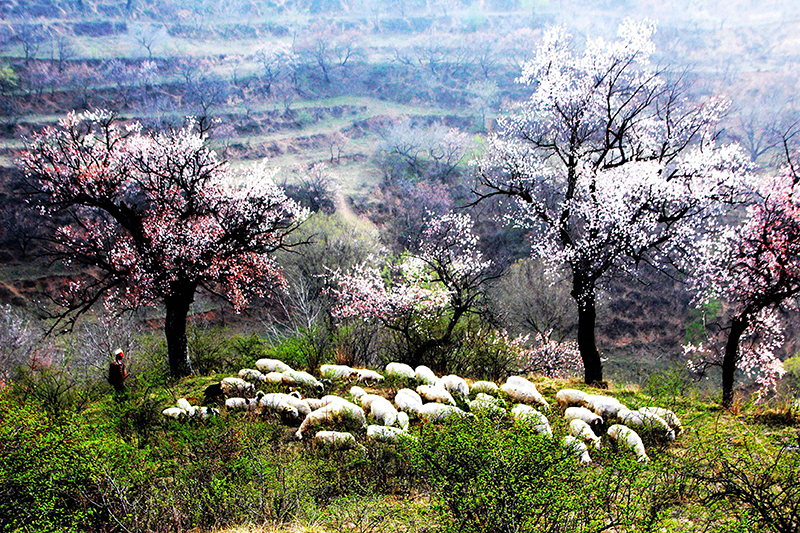 作品簡介:拍攝于甘肅省華亭市安口鎮陽安村。陽安村植被富集,生態良好,是養畜的好地方。春暖花開,壹名回族老人正在杏花林李放羊。
