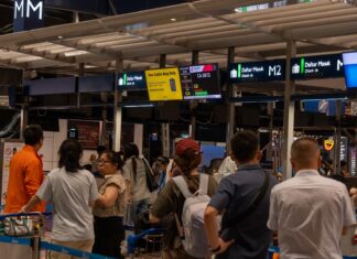當地時間16日晚,吉隆坡國際機場中國國際航空公司(簡稱“國航”)值機櫃檯前,乘客已排...