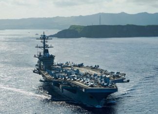 美国海军的3艘航母在巡洋舰、驱逐舰、战斗机...