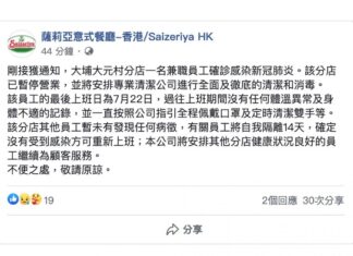 連鎖餐廳「薩莉亞」表示,大埔大元村分店一名...