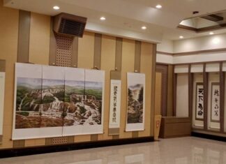 ▲王慶海(中)為此次活動創作的國畫作品,並...