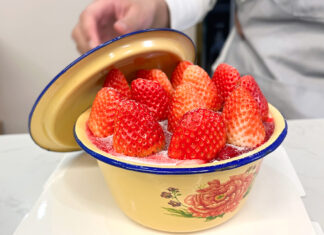 覆滿一層誘人紅顔草莓的奶油蛋糕裝在頗有復古感的搪瓷盆裡,淡黃的盆蓋、盆身上繪有...