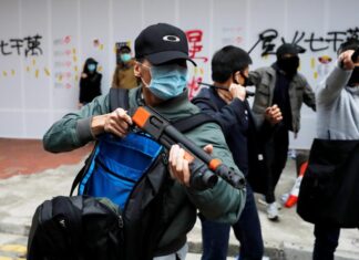 2020年港人元旦大游行途中手持武器指向示威者的便衣警察。 图片来源:路透社/Tyrone Siu 警方消息指,一名63岁男子傍晚6时许途经屯门建荣街25号对开街头时...